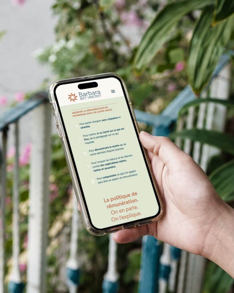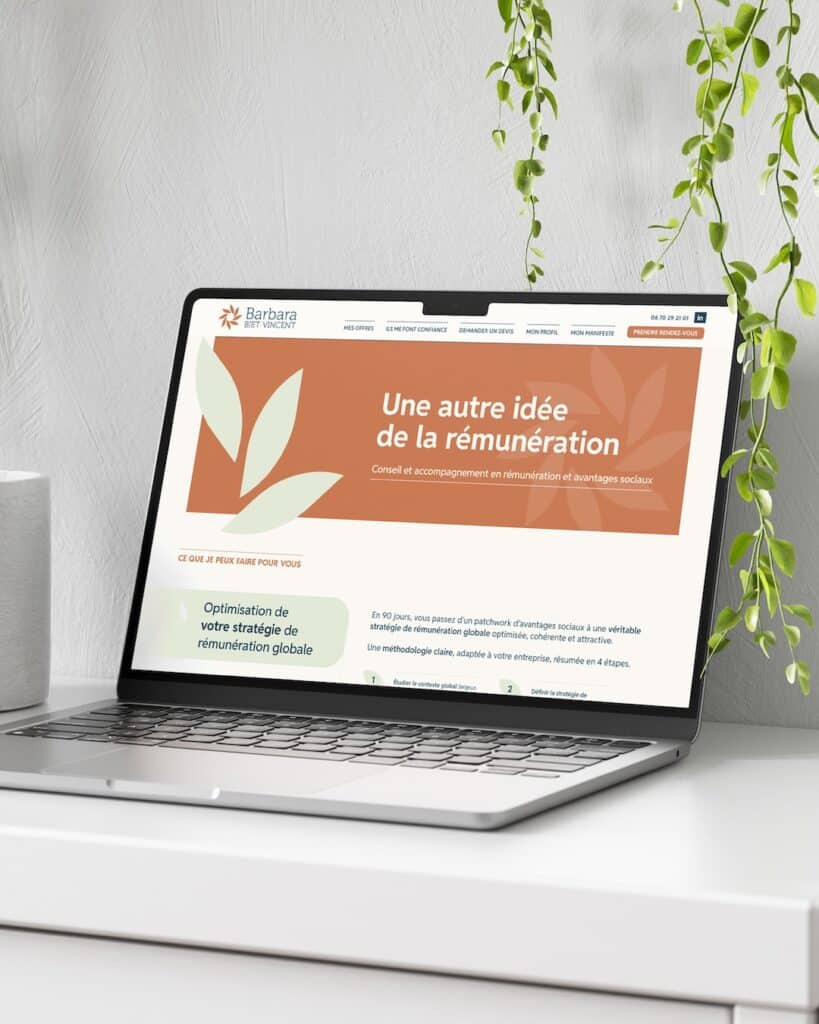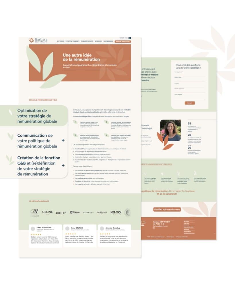 À partir des ateliers d’intelligence collective que nous avons réalisé avec elle, nous avons eu la matière pour envisager une identité, dessiner un logo, et définir les éléments de sa landing page (des offres bien définies, un manifeste pertinent, une prise de rendez-vous facile…).