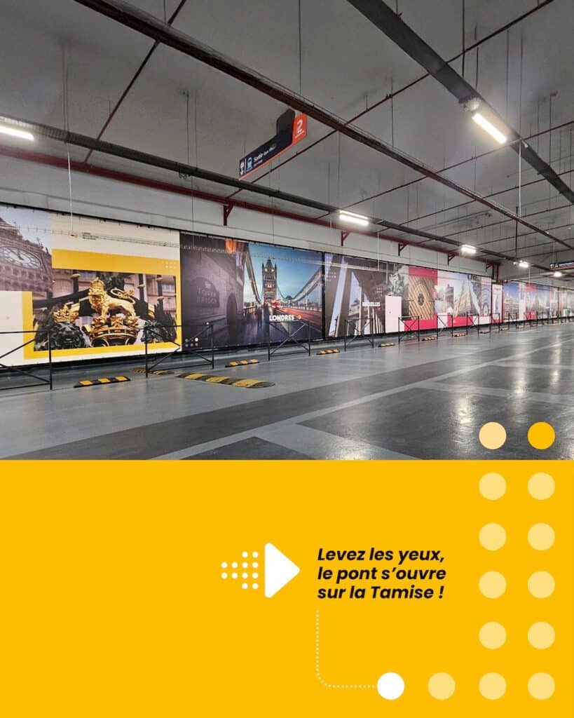 Alors, en collaboration avec les Ă©quipes Effia, nous avons vu grand. TrĂšs grand. Des bĂąches monumentales – jusqu’à 32 mĂštres de long – qui transforment le lieu en carnet de voyage. Sur chaque niveau, des photographies de destinations parisiennes (signĂ©es Arthur Corgier) : un regard, des lieux emblĂ©matiques, et des escales europĂ©ennes Ă  quelques heures de train : Londres, Bruxelles, Amsterdam